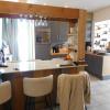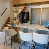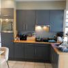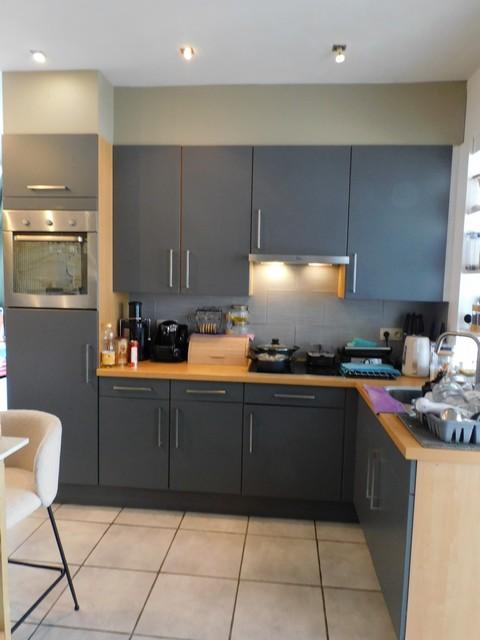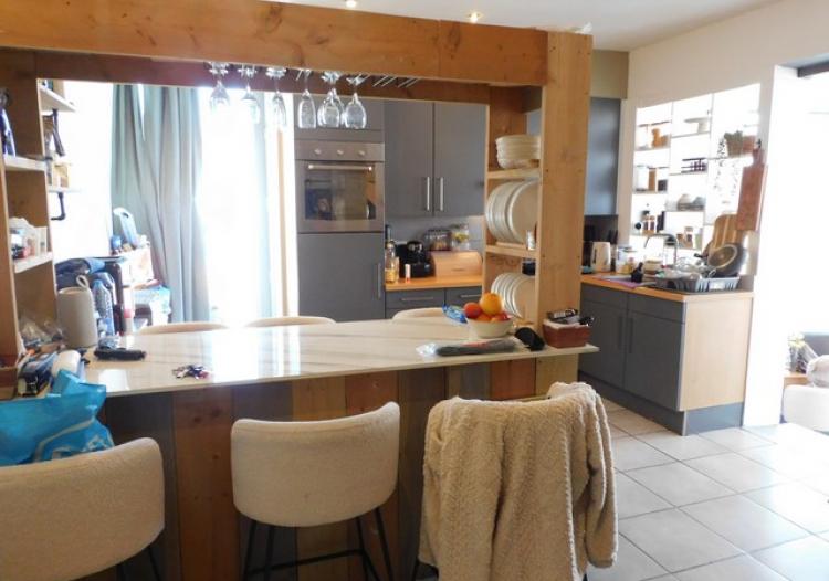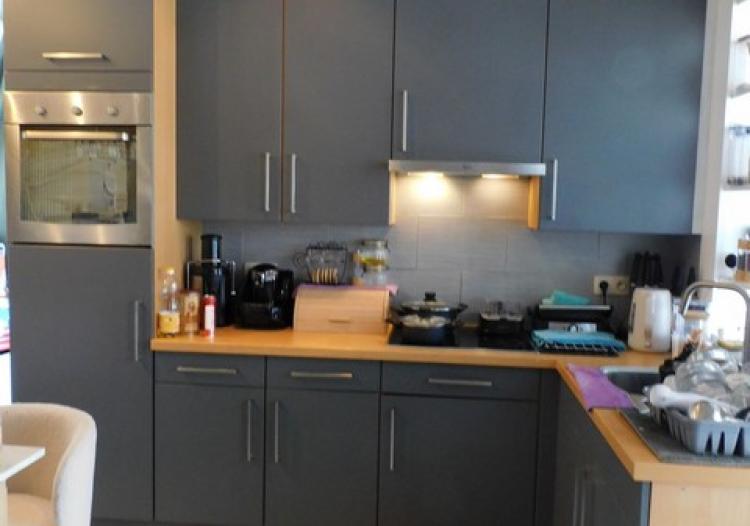 Gelegen op de eerste verdieping en bereikbaar via de trap, kom je binnen in een gezellige keuken met eetruimte. De keuken is volledig uitgerust met een spoelbak, kookvuur, dampkap, oven en koelkast – perfect voor wie graag kookt. Aansluitend vind je de lichtrijke leefruimte, waar de grote raampartijen zorgen voor een overvloed aan natuurlijk licht en een aangename sfeer.