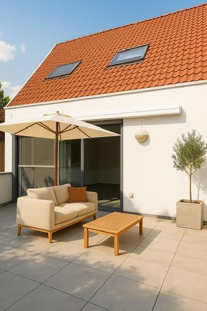 Bij binnenkomst treffen we de inkomhal met gastentoilet. Via de inkomhal heeft u toegang tot zowel de leef- en eetruimte als de keuken. De leefruimte geniet van heel wat lichtinval en is de ideale plek om te ontspannen. Via de leefruimte bereikt u de bureau-/zitruimte. De keuken is volledig uitgerust met alle toestellen en biedt eveneens zitruimte, ideaal voor een snel ontbijt of een gezellig glas wijn. Naast de keuken bevindt zich de was- en bergplaats die ook beschikt over een handige uitgietbak. Het schuifraam in de leefruimte geeft toegang tot het zonnige terras met automatische zonneluifel. Hier kan je heerlijk genieten van de buitenlucht. Aan de rechterzijde van de leefruimte beschikt u tevens over een extra balkon.
