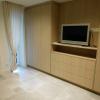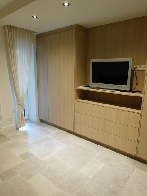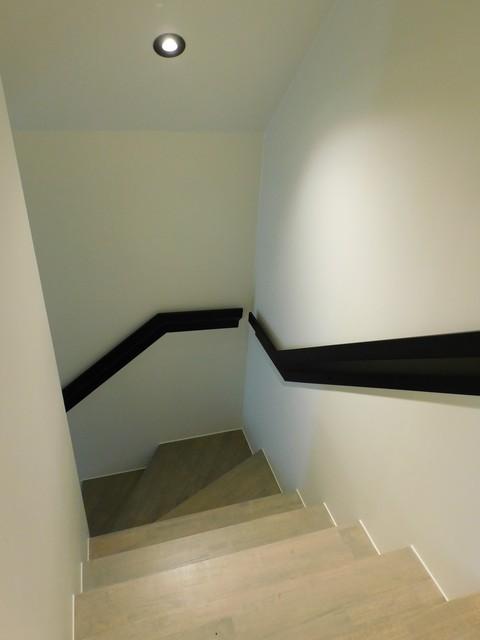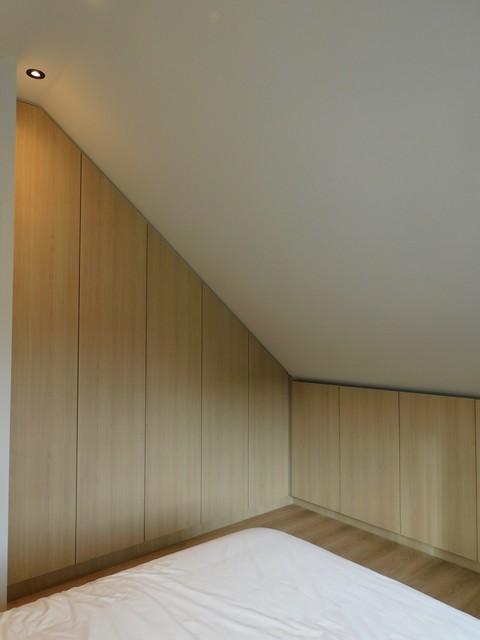 Op het gelijkvloers bevindt zich tevens een stijlvolle badkamer met lavabomeubel, inloopdouche en toilet, aansluitend aan een gelijkvloerse slaapkamer met inbouwkasten en airco.