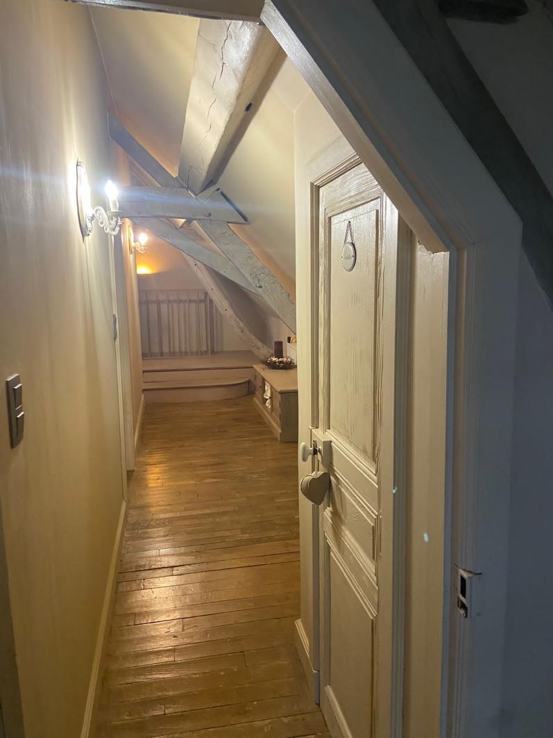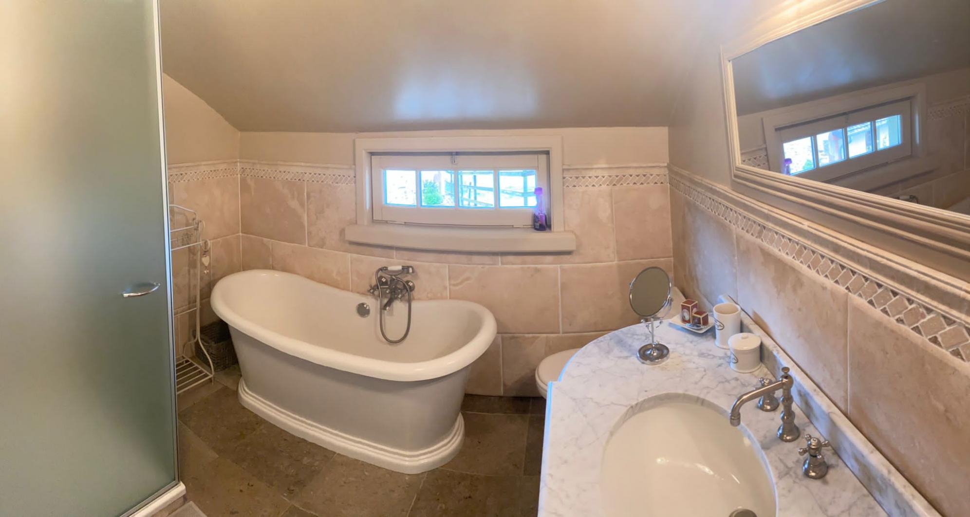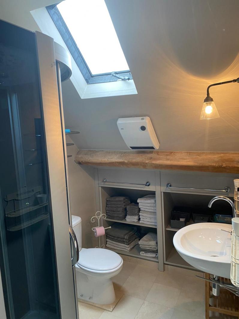 Op de verdieping zijn 3 slaapkamers, elk voorzien van een eigen lavabo. Alle ramen zijn voorzien van rolluiken met verluchting. De vloeren bestaan volledig uit eiken parket. Er is tevens een toilet boven.