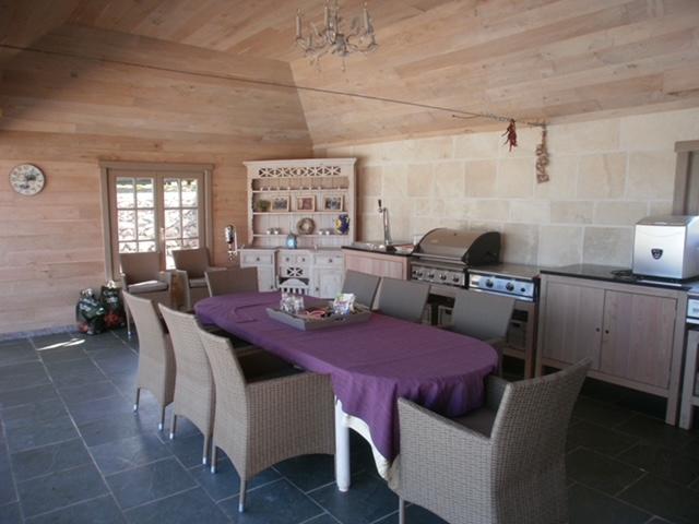 Er is een ingericht poolhouse met buitenkeuken, bbq en zelfs een tapinstallatie voor bier! Er is eveneens een sanitaire ruimte met lavabo, douche en toilet. Op het binnenplein treffen we een carport voor 4 voertuigen + 1 afgesloten garage.