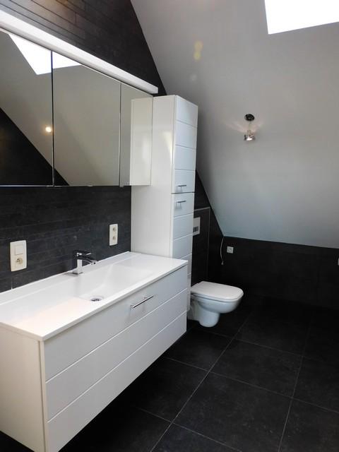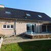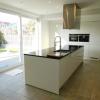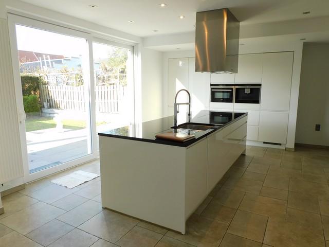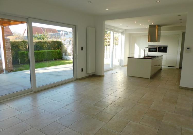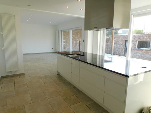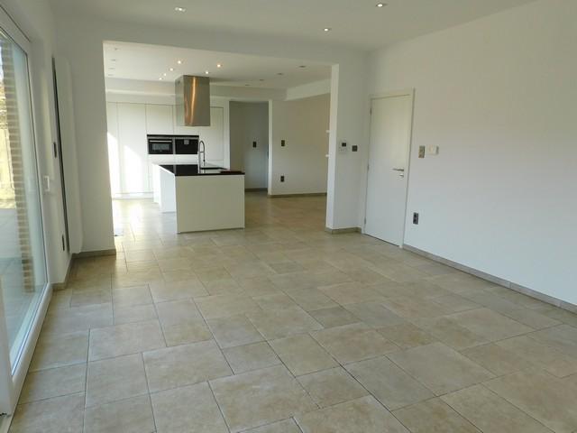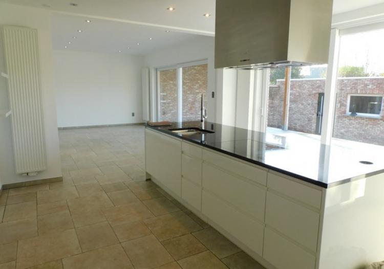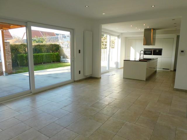 We komen binnen in de inkomhal met inbouwkasten en bergruimte. De leef- en eetruimte vormen een mooi geheel samen met de open keuken met kookeiland. De keuken is volledig uitgerust met een kookvuur, dampkap, spoelbak, vaatwasser, combi-oven, koelkast en koffiemachine. Verder treffen we op het gelijkvloers een apart toilet, wasruimte, extra bergruimte en een bureau/speelkamer. De schuiframen in de leefruimte kijken uit op de tuin.