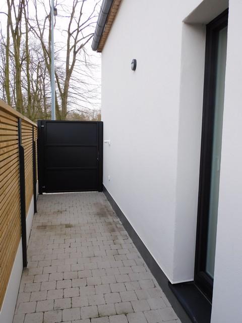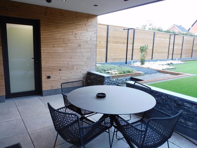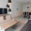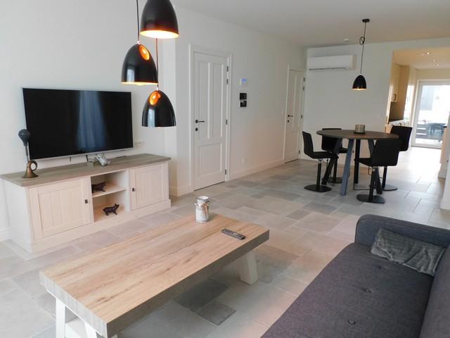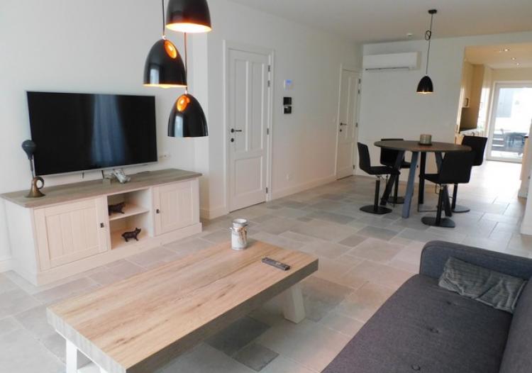 Bij het binnenkomen betreedt u de inkomhal met apart gastentoilet. De woning beschikt over een lichte leef- en eetruimte, voorzien van airco, ideaal voor elk seizoen. De moderne keuken is volledig uitgerust met kwaliteitstoestellen: inductievuur, dampkap, combi-oven, spoelbak, vaatwasser, grote koelkast en diepvries. Via het schuifraam in de keuken heeft u directe toegang tot het overdekte terras, perfect voor gezellige momenten buiten.