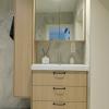 Op het gelijkvloers bevindt zich tevens een stijlvolle badkamer met lavabomeubel, inloopdouche en toilet, aansluitend aan een gelijkvloerse slaapkamer met inbouwkasten en airco.